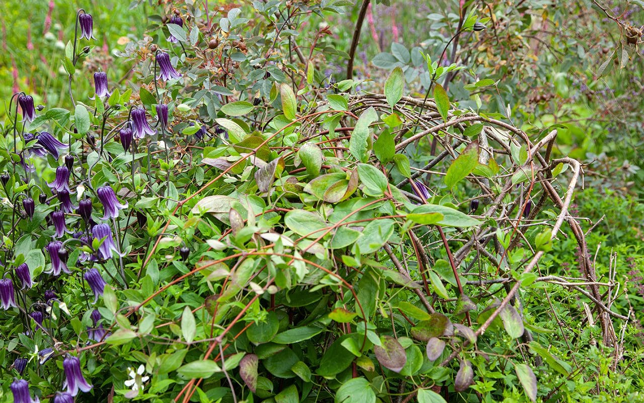 The garden has stood the test of our exposed position remarkably well. I stake lightly, preferring the garden to be composed of plants that are not reliant upon us to keep them upright. The wiry stems of the hemerocallis and dierama and the pliable Calamagrostis ‘Karl Foerster’ were almost made for wind and withstand even the rain-laden gales, but the plants that topple when in the full sail of summer growth need assistance. Taller than me, sanguisorba that would splay in a great cartwheel without support and echinops that would derail an area as wide as they are tall if they broke loose from their metal hoops. Staking takes valuable time in the rush to finish the garden work before growth starts in earnest in the spring, but our metal hoops work and are fast to install.