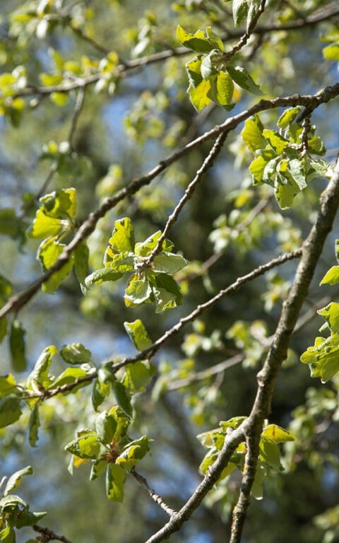 At altogether another scale and entirely more manageable, I planted the whitebeam, or what I believed to be whitebeam in the blossom wood to take the silver up onto our side. Sorbus aria also has a delectable moment which is no more than a week of awakening. The leaf buds light the tree silver before it dims to a pleasantly grey-green. Unbeknownst to me the whips I was supplied with were the Swedish Whitebeam, Sorbus x intermedia. A wonderful tree for a seaside setting or an exposed site, but here it is already being left behind as the Geans and the faster growing trees in the blossom wood outstrip it. No matter. We will enjoy the mistake whilst it lasts as we do the awakening of the poplars when they are in their moment.