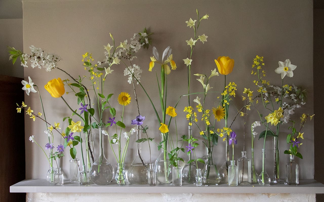 Forsythia suspensa | Prunus avium | Narcissus ‘White Lady’ | Hyacinthoides non-scripta ‘Alba’ | Anemone blanda | Tulipa ‘Golden Oxford’ | Vinca oxypetala | Narcissus ‘Pipit’ | Brassica rapa subsp. chinensis | Gladiolus tristis | Doronicum x excelsum ‘Harpur Crewe’ | Anemone coronaria ‘Mister Fokker’ | Iris x hollandica ‘Montecito | Papaver cambricum | Iris lazica