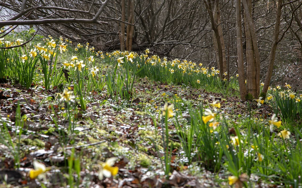 Narcissus pseudonarcissus (main image) feels most at home here on our slopes, where there is shade enough for them not to have to compete with the grasses. They grow wild in the next valley over, where the mossy banks above the deep holloway of the lanes are strewn with them. Despite their stature, for they stand neatly at no more than a foot tall, they look down on you there and defiant of whatever March weather throws at them. And being naturalised, they appear to have moved easily, following the lie of the land that suits them.